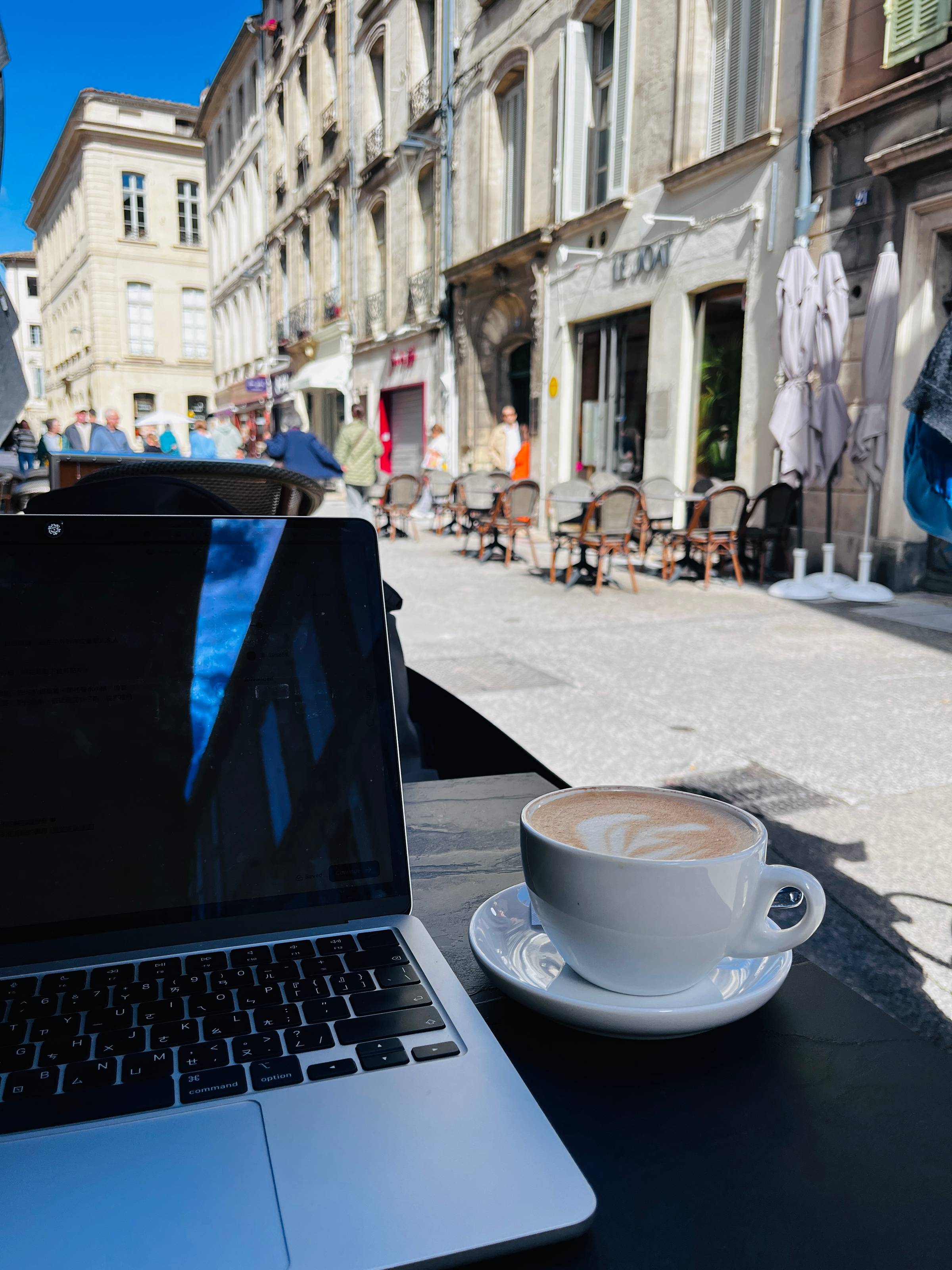 現在的我正在南法雅維農 (Avignon) 舊城區的一間咖啡廳,坐在戶外的座位看著人來人往,敲打著筆電的鍵盤(底下附照片)。