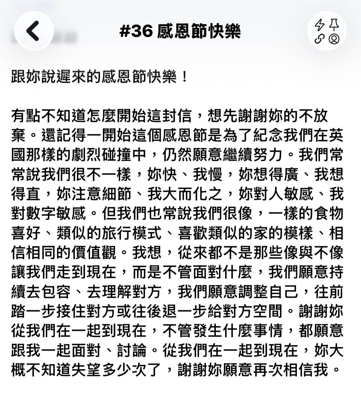 但是最後,我們兩個人都沒有放棄,沒有放棄溝通、沒有放棄為這段關係繼續嘗試、調整自己。為了感謝我們的沒有放棄,我們將那天訂為屬於我們的感恩節。